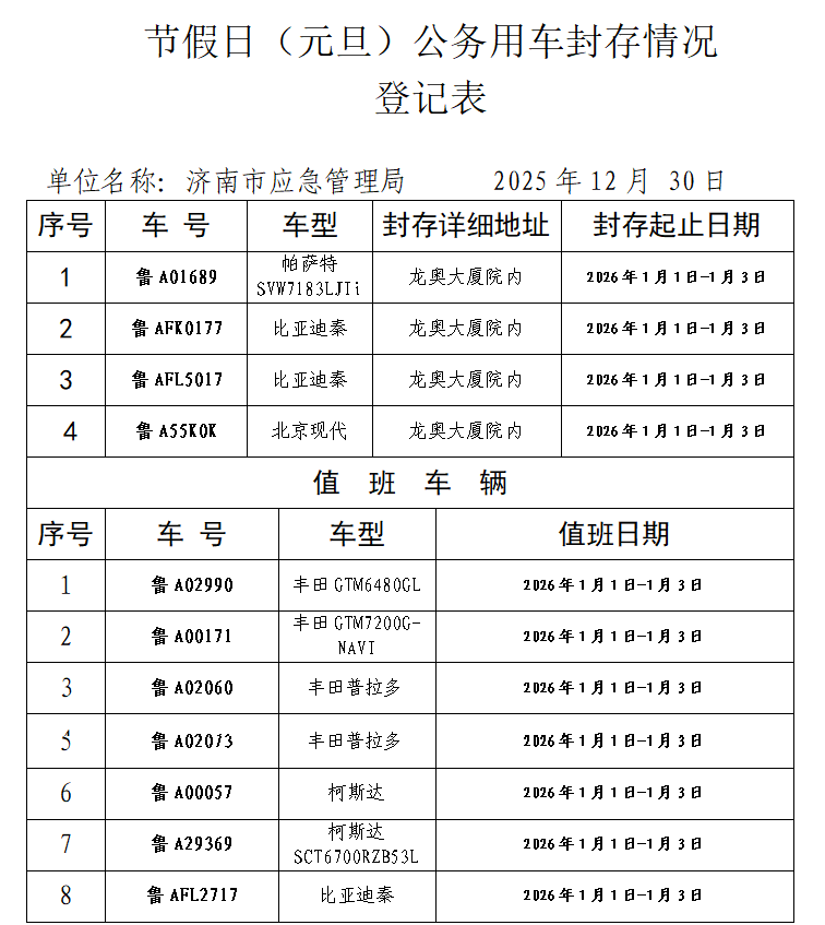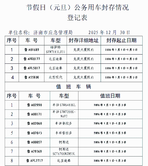 济南市应急管理局关于节假日(元旦)公务用车封存情况登记表